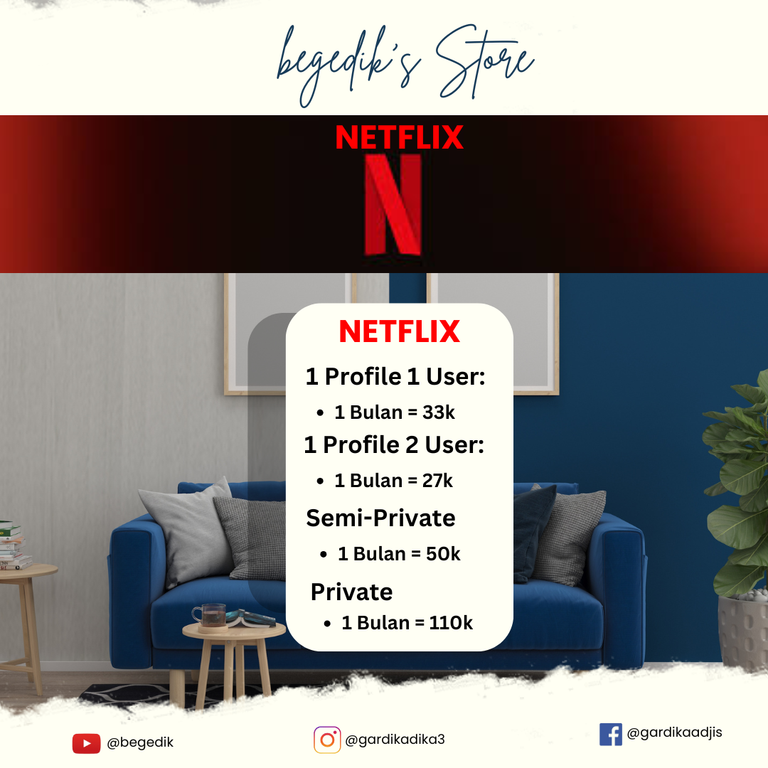 - 1P1U: 33k/Bulan - Semi-Private: 50k/Bulan - Private: 110k - 1U --> 1 Profil 1 User, 1 akun berisi 5 orang, jarang screen limit, karna yang mengisi slotnya cuma 5 orang saja. Kalau seumpama limit, berarti 4 orang lagi menonton, dan 1orang harus nunggu sekitar 45/60 menit, karna layar netflix itu cuman ada 4 layar & 5 Profil. - 2U --> 1 Profil 2 User, 1 akun berisi 10 orang, sering screen limit (no complain). Karna yang mengisi slot ada 10 orang. Kalau seumpama limit, berarti 4 orang lagi menonton, dan 6 orangnya lagi harus menunggu. Karna layar netflix max cuma 4 layar dan 5 profil. - SEMI PRIVATE --> Brisi 4 User,4 akun berisi 4 orang, jarang limit screen,karna yang mengisi slotnya cuma 4 orang saja,lebih cocok digunakan ke TV atau All device,nonton juga lebih aman dan nyaman,harga lebih mahal - PRIVATE ACCOUNT --> Berisi 5 profil, 5 device, bisa diganti nama profil, pin, kualitas UHD(tergantung device masing masing, kalo hp/pc/laptop, misal layarnya ga support UHD 4K