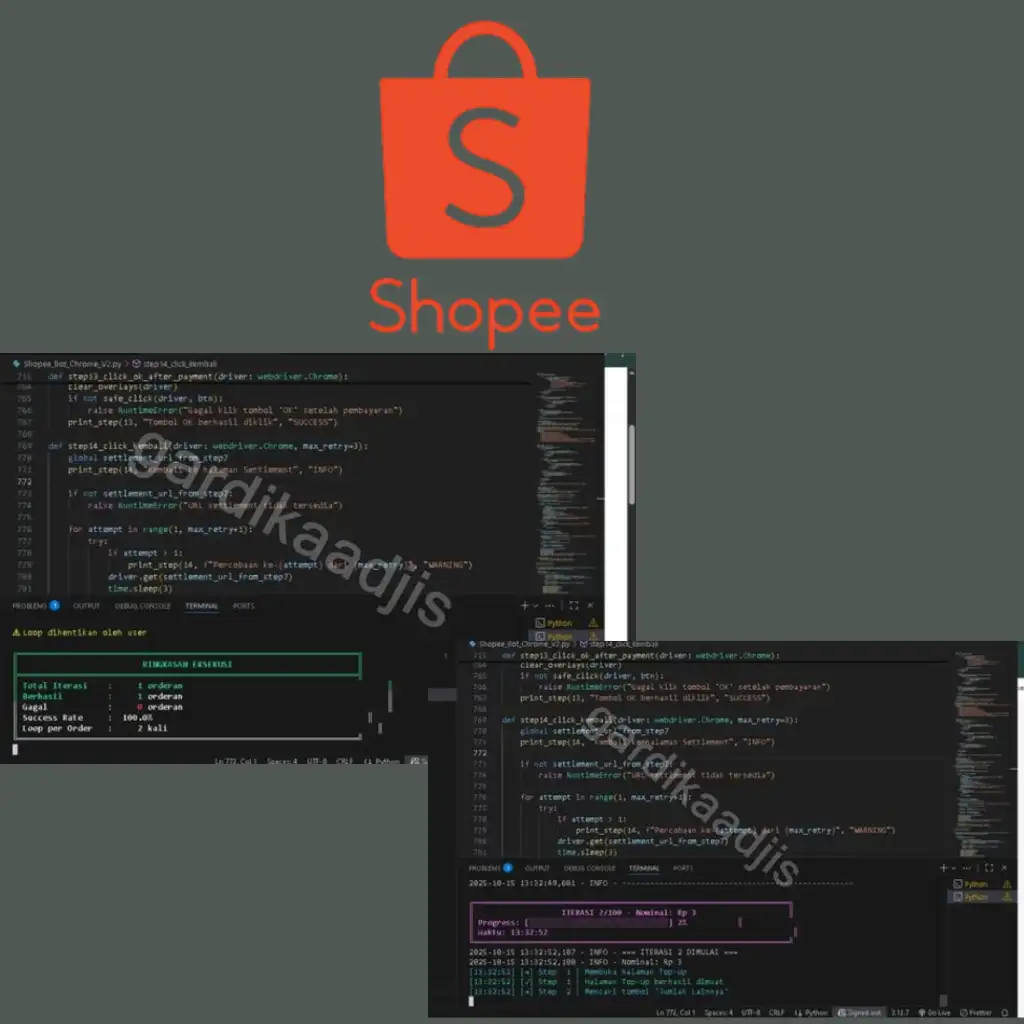 Informasi: - Program Javascript & Python - Windows 10 / 11 64 bit - Linux - Mac OS Keuntunganya apa aja? - Meningkatkan Visibilitas Produk dan Toko. Dengan iklan, produk kalian bisa langsung muncul di posisi teratas halaman pencarian, di bagian "Rekomendasi", atau di halaman utama. Ini seperti memindahkan toko kalian dari gang kecil yang sepi ke jalan raya utama yang ramai. - Meningkatkan (Traffic) akun / penjualan. Iklan Shopee (khususnya Iklan Pencarian Produk) menargetkan pembeli yang memang sedang aktif mencari produk seperti yang kalian jual. Setiap klik dari iklan adalah calon pembeli potensial yang sudah memiliki niat membeli. Semakin banyak pengunjung, semakin besar peluang terjadinya penjualan. - Meningkatkan Penjualan (Konversi) Dengan mendatangkan pengunjung yang relevan, kemungkinan mereka untuk membeli produk kalian menjadi jauh lebih tinggi. Iklan yang efektif akan menghasilkan Return on Investment (ROI) atau keuntungan.