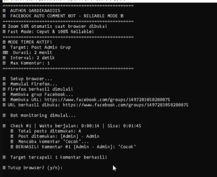 Bot Auto Comments Facebook dengan berbagai fitur: - ✅️Fitur Timer sesuai waktu yang ingin di setting saat bot berjalan sesuai timer yang ditentukan. - ✅️Fitur auto Refresh berdasarkan jumlah detik - ✅️Fitur setting komentar, bisa setting banyak komentar yang diinginkan. - ✅️ Fitur Schedule bisa komen diberbagai grup dan target name sesuai schedule yang ditentukan - ✅️Fitur Auto komen khusus Admin Grup. - ✅️Fitur Auto Komen khusus nama target. - ✅️Fitur setting target grup sesuai yang diinginkan. Video: https://youtu.be/Mif2-j0z60A?si=ct-ksfGaSnXYmVjQ